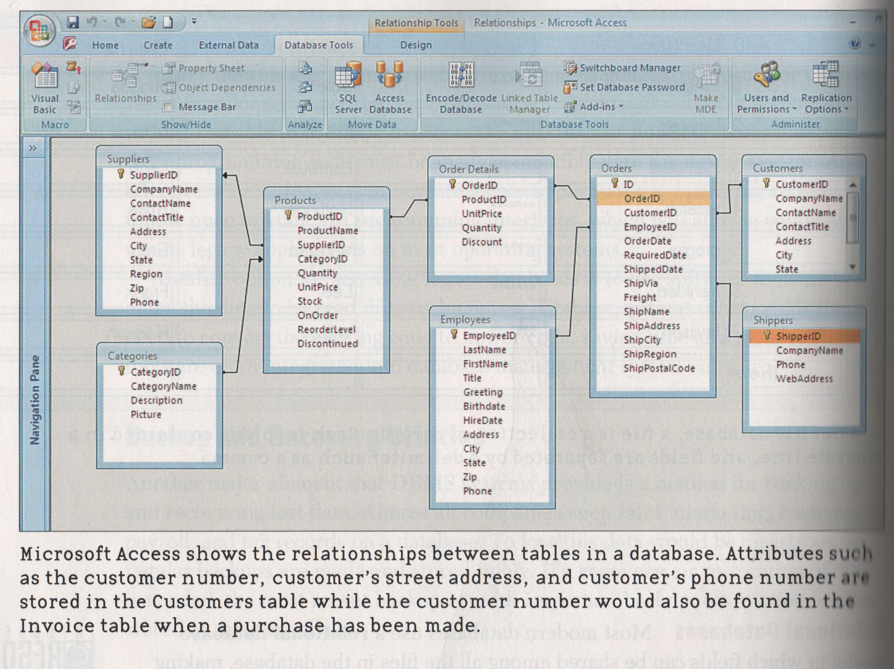 C.  A database can be classified according to  the model used for its design. There are five common database models, flat  file, relational, object-oriented, distributed and multimedia. This video will  focus on the relational model.  In  relational database is an advanced version of basic database model.  The traditional flat file database so-called  because it contains only one file. That file consists of individual records  comprised of fields of data.  In  relational database terminology. Databases files are called tables, records are  called tuples and fields are called attributes. A disadvantage to a flat file  database is that it consists of one file that contains records that must be  searched in sequence. The process can be slow.   The relational database on the other hand are made of several related  files called tables. The information in each table is limited to one type of  record. The customer table might contain only billing address and contact  information.  A product table might  contain information related to inventory items such as manufacture, model,  purchase cost, sales price, supplier and quantity in stock. An invoice table  might only contain reference numbers and product numbers. The do we address the  jobs would not appear in the invoice itself but the printed invoice would  include a full billing address and then looked up in the customer table as the  invoice had been created.  In a  well-designed relational database, the information is never entered a second or  third time. Attributes are stored once and shared among the related tables. Any  attribute that is changed in one table is automatically changed in all the  other tables.